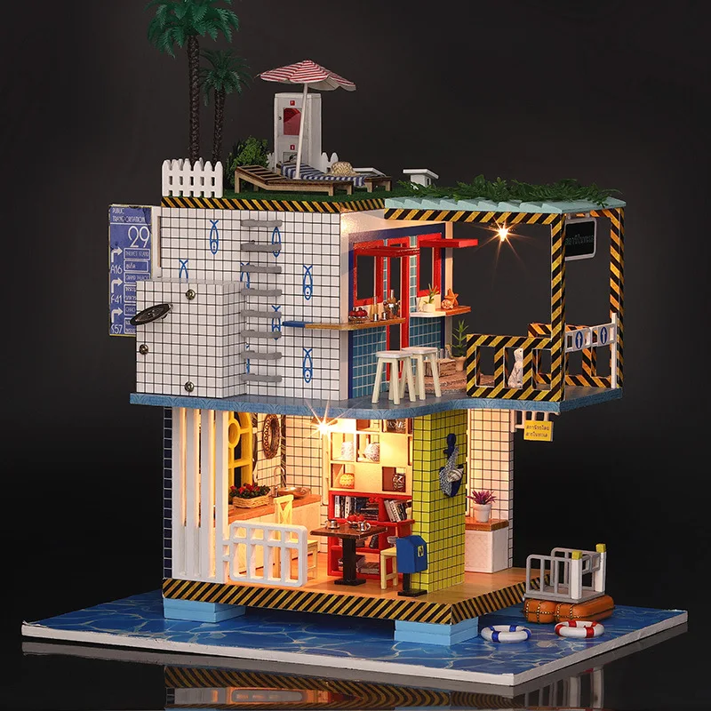 Miniature Hawaii Style Leisure Holiday Dollhouse Wooden Puzzle Model Furniture Kits DIY Dolls House